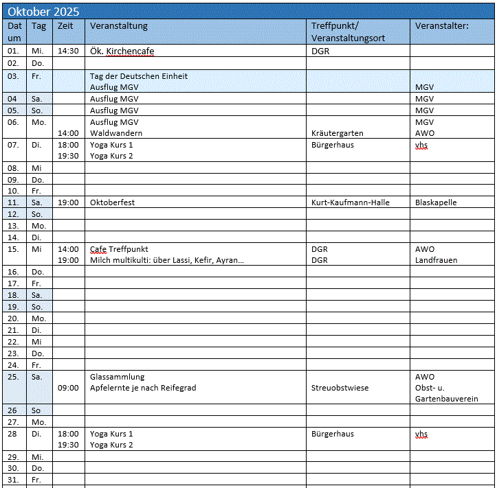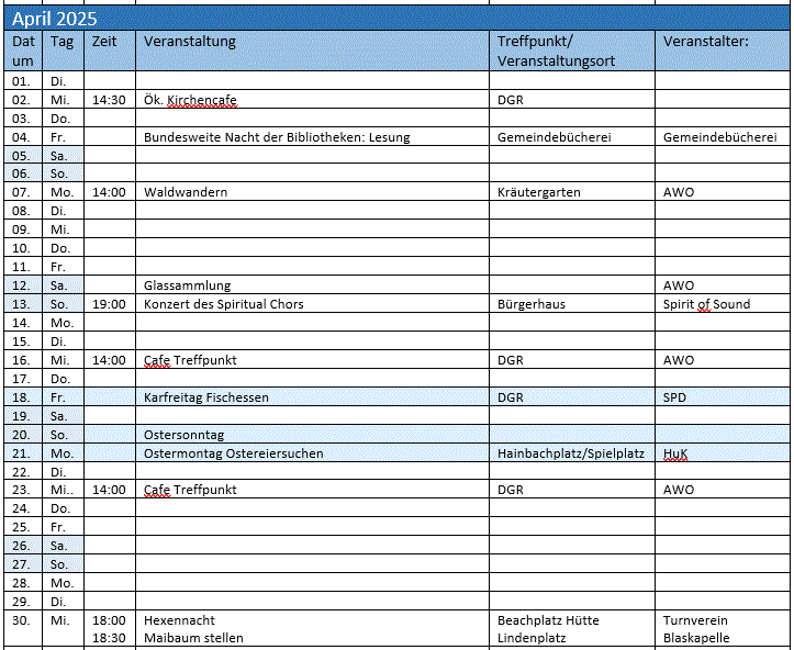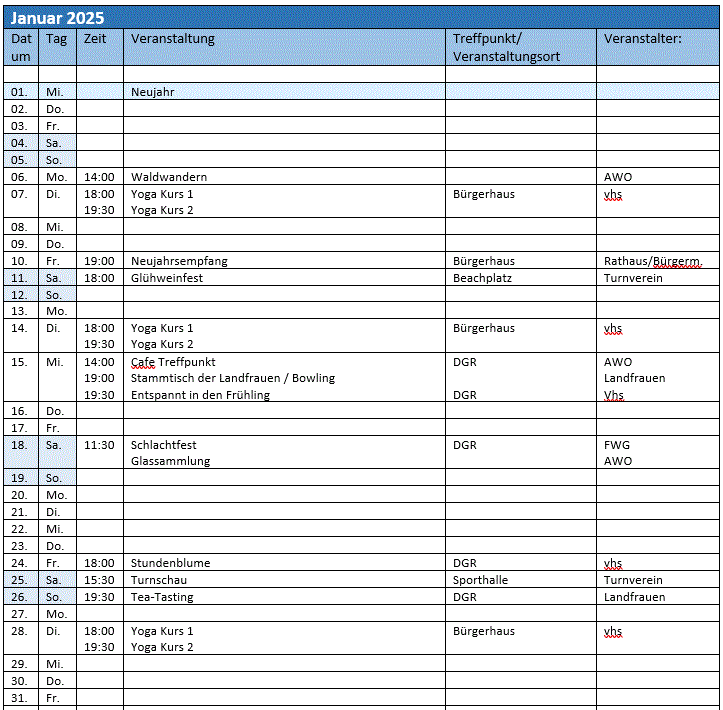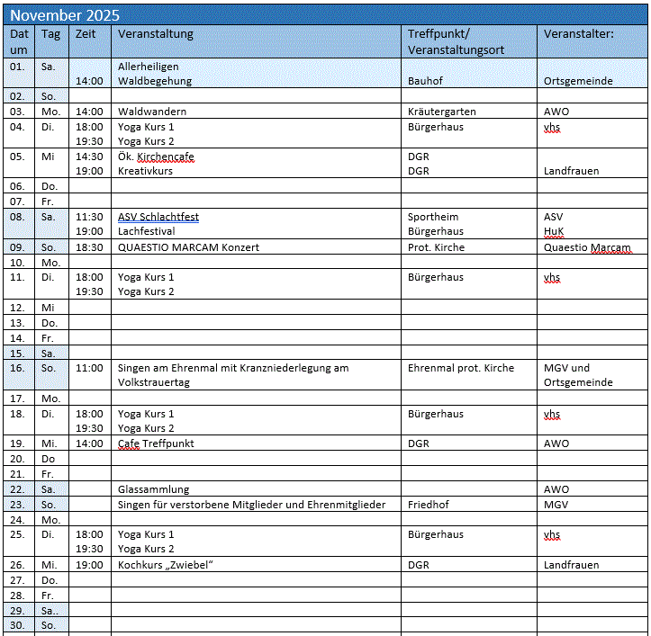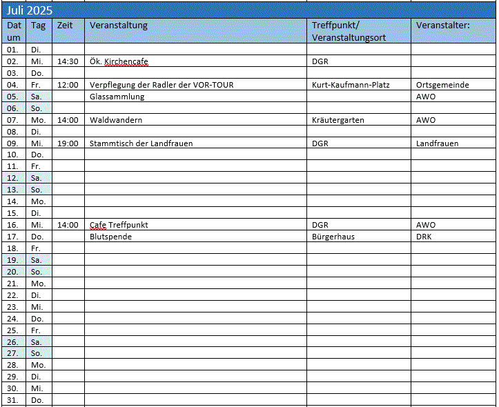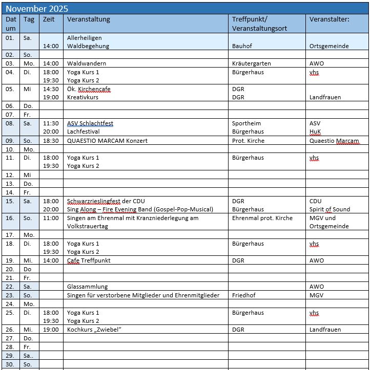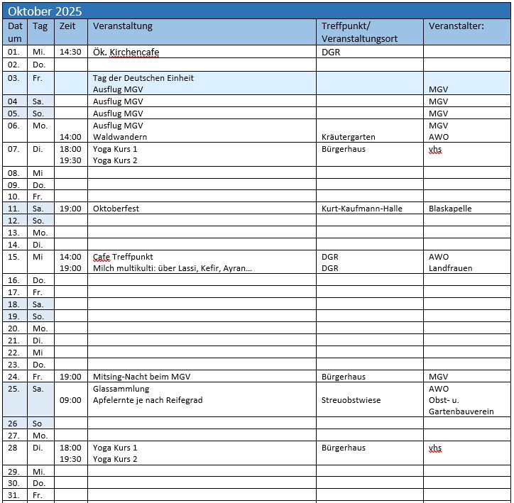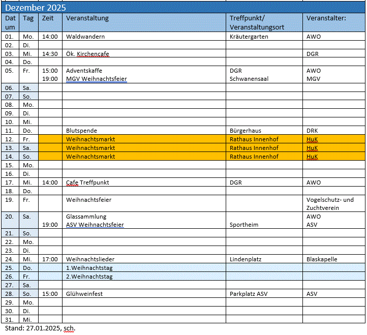 Anmerkung: Unterlegung in hellblau sind Feiertage
