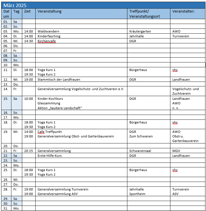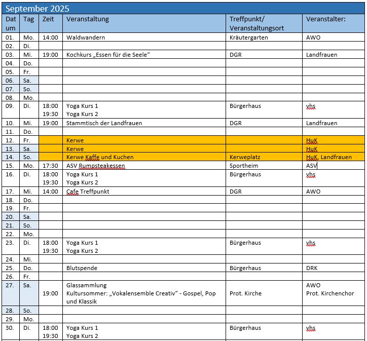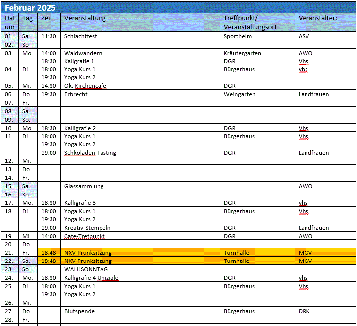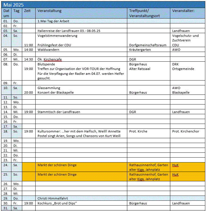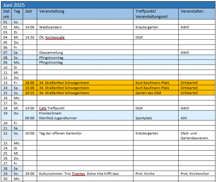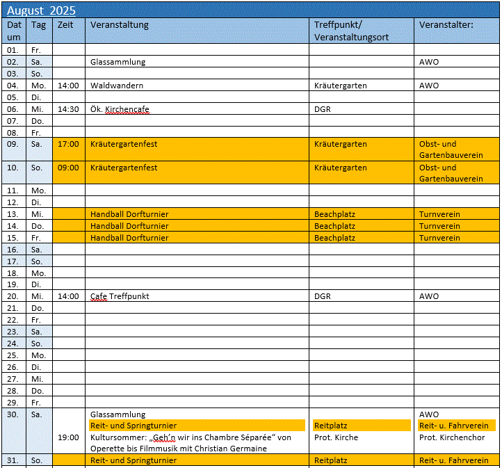 Anmerkung: 	Unterlegung in orange bedeutet „mehrtägige Veranstaltung“